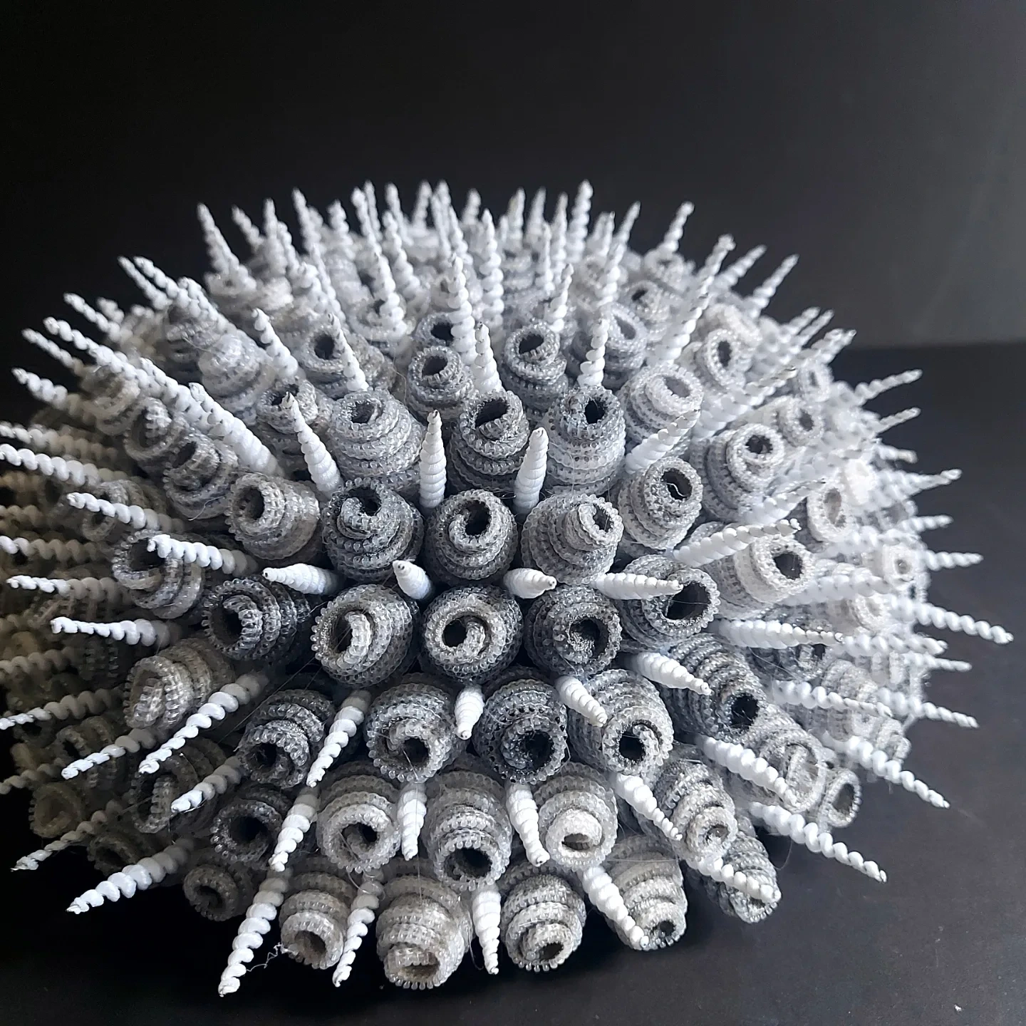 Marian’s work is deeply rooted in her relationship with nature. Not just in its outward beauty, but in its overlooked textures: the bark of a tree, the wrinkled surface of lichen, the erosion of rocks by wind and tide. Her style is instantly recognisable. Monochrome or pastel in palette, yet never minimal. These are pieces that demand closer inspection. Her vessels, wall art and abstract spheres often appear fossilised or unearthed, as if extracted from the natural world rather than made by hand. There’s a remarkable synergy between fragility and strength, intricacy and boldness—a tension that reflects the natural elements that inspire her.
