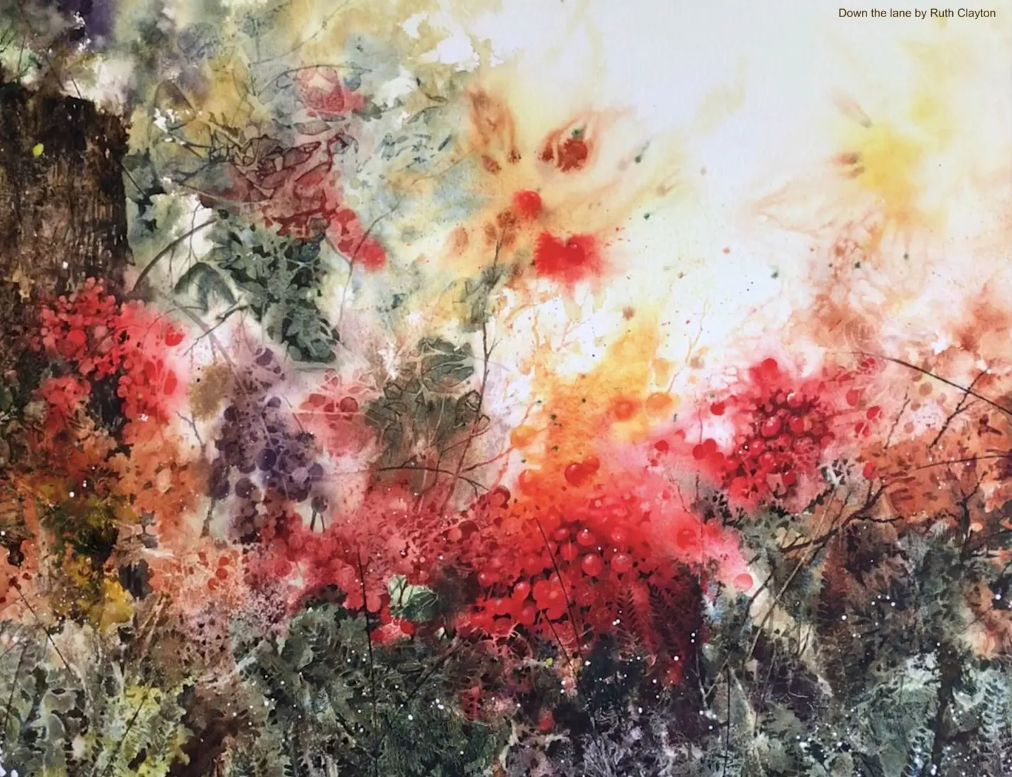 Ruth: It’s not saying, isn’t it all the gear? No idea. It is here. And I’ve had people come to my class and they’ve got all this fantastic gear, but you need to know how to use it. And actually, you could just take a quarter of that and you’d get good results. So I don’t think you need to break the bank. And yeah, I do use cling film, I use salt. That was fantastic things for watercolor, if you allow it to do its little patterns. And I use rice, I put rice on it. That’s really wonderful for, like, hedgerows and things like that. So there are things that you just find around the house. And I use four brushes. I’ve got a palette of about seven colors. I use one particular paper. It’s just really cheap and cheerful. I know what it does, I know how you can lift watercolor off it. It’s just boxingford. And I never really vary from that. I don’t, you know, I just think I know what that does. Now, I have treated myself to some Daniel Smith watercolors, which are lovely.