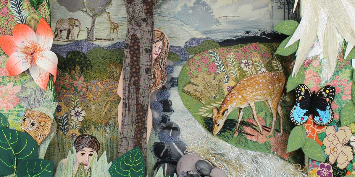 Creating the piece rather like a theatre set or diorama was a challenge but I hoped it would enhance the feeling of a story evolving or a scene in a play. After reading the Genesis stories I had ideas of what to include in the garden, and tried to represent different forms of life. I included large and small mammals, a bird of paradise, fish, insects, the snake, various plants and trees including the apple and fig trees. There is a hint of gold in the distance and a river flowing out of the garden. I used a deep wooden frame and built the piece around this using silk fabric remnants mostly from Japanese kimonos. The technique included applique and free motion machine embroidery along with hand embroidery.