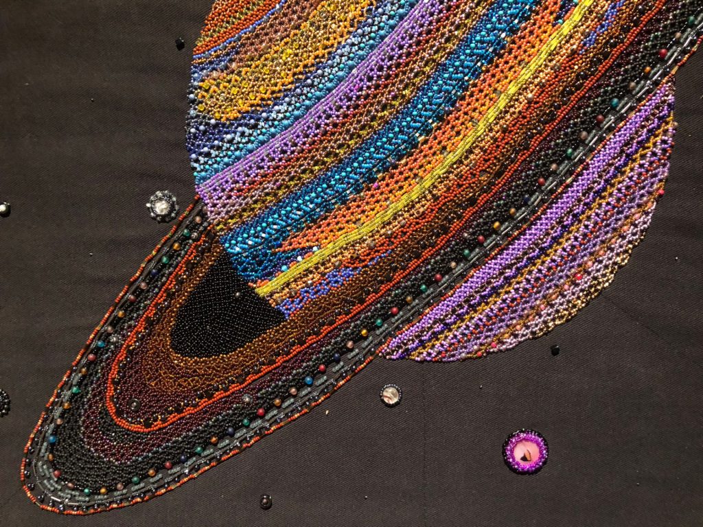 Based in Northern Canada, Margaret says that it was her love of fabric, texture and colour that attracted her to textile art. She began her career as a seamstress before focusing on recreating Northern Landscapes. In 2008 her subject matter changed to cosmic images afer inspired by images taken by the Hubble space telescope. She uses glass beads of various sizes and designs to capture the shimmering beauty of her subject matter, which are typically stitched onto black velvet or canvas.